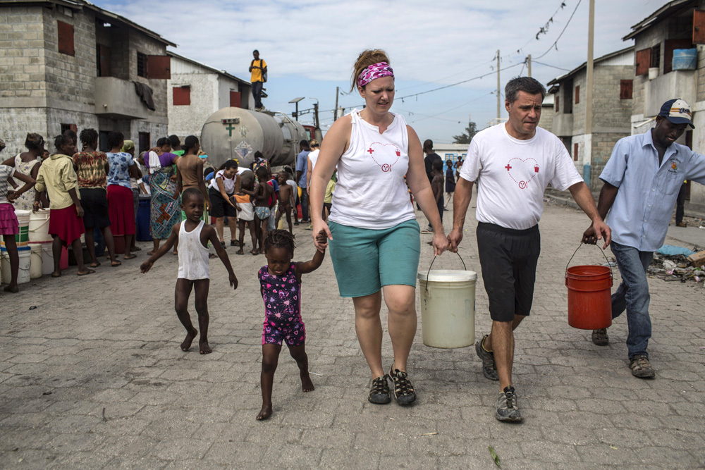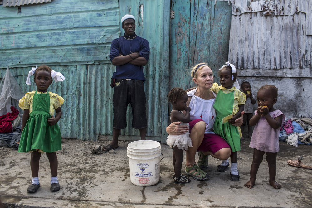 Distribution d’eau dans le bidonville de Cité Soleil. Jenny, accompagnatrice du groupe, se charge de faire les photos souvenirs pour le reste de l'équipe