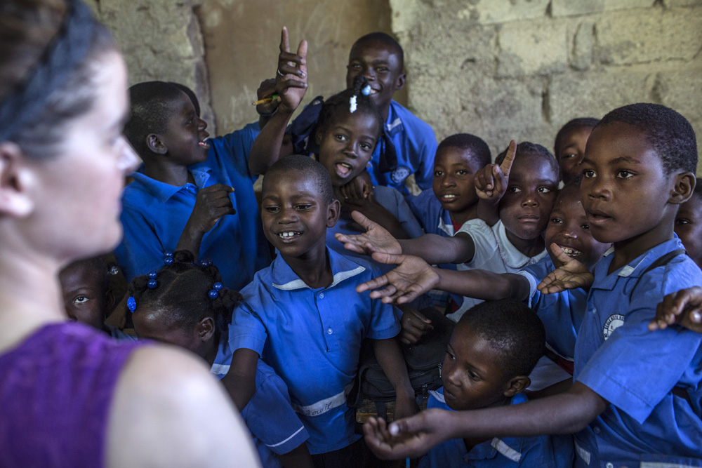 Moment de complicité entre les volontaires venus du Minnesota et les orphelins du Grace Village. La bouteille accrochée au tee-shirt est une lotion désinfectante pour les mains